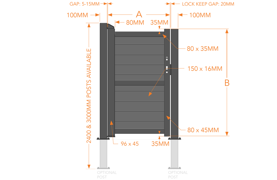 Fully boarded pedestrian gate with a horizontal solid infill and flat top, providing full privacy with a modern and streamlined design.